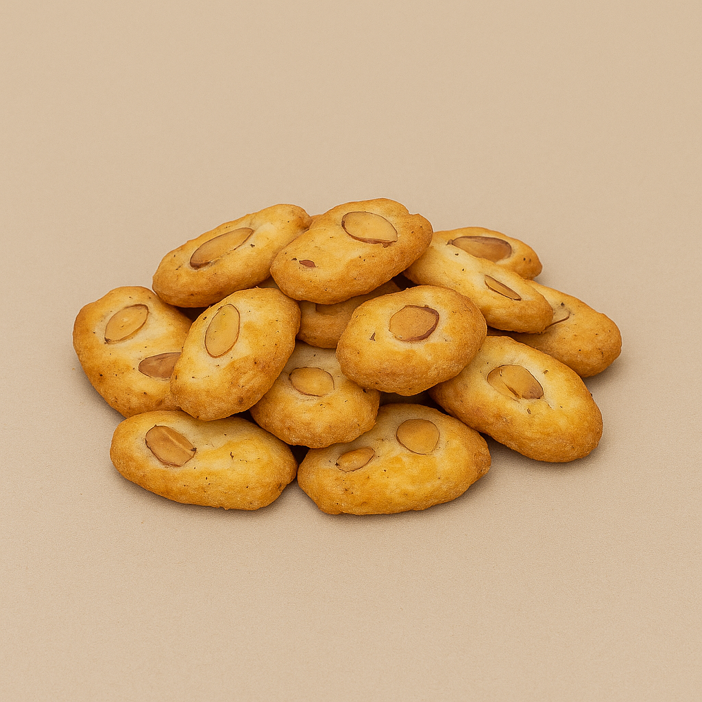 Crackers de riz japonais croustillants avec des amandes entières. Une collation salée et noisettée avec une expérience gustative japonaise authentique – idéale pour l'apéritif.