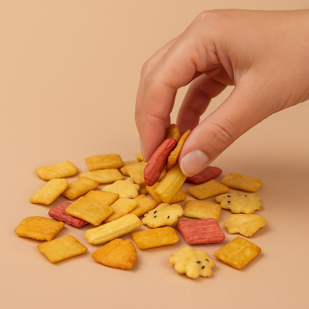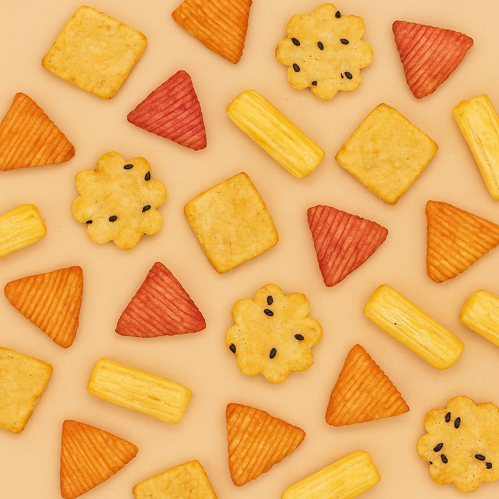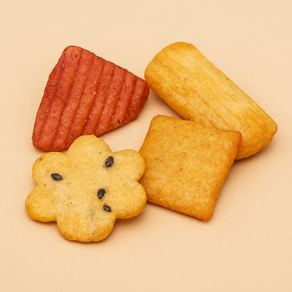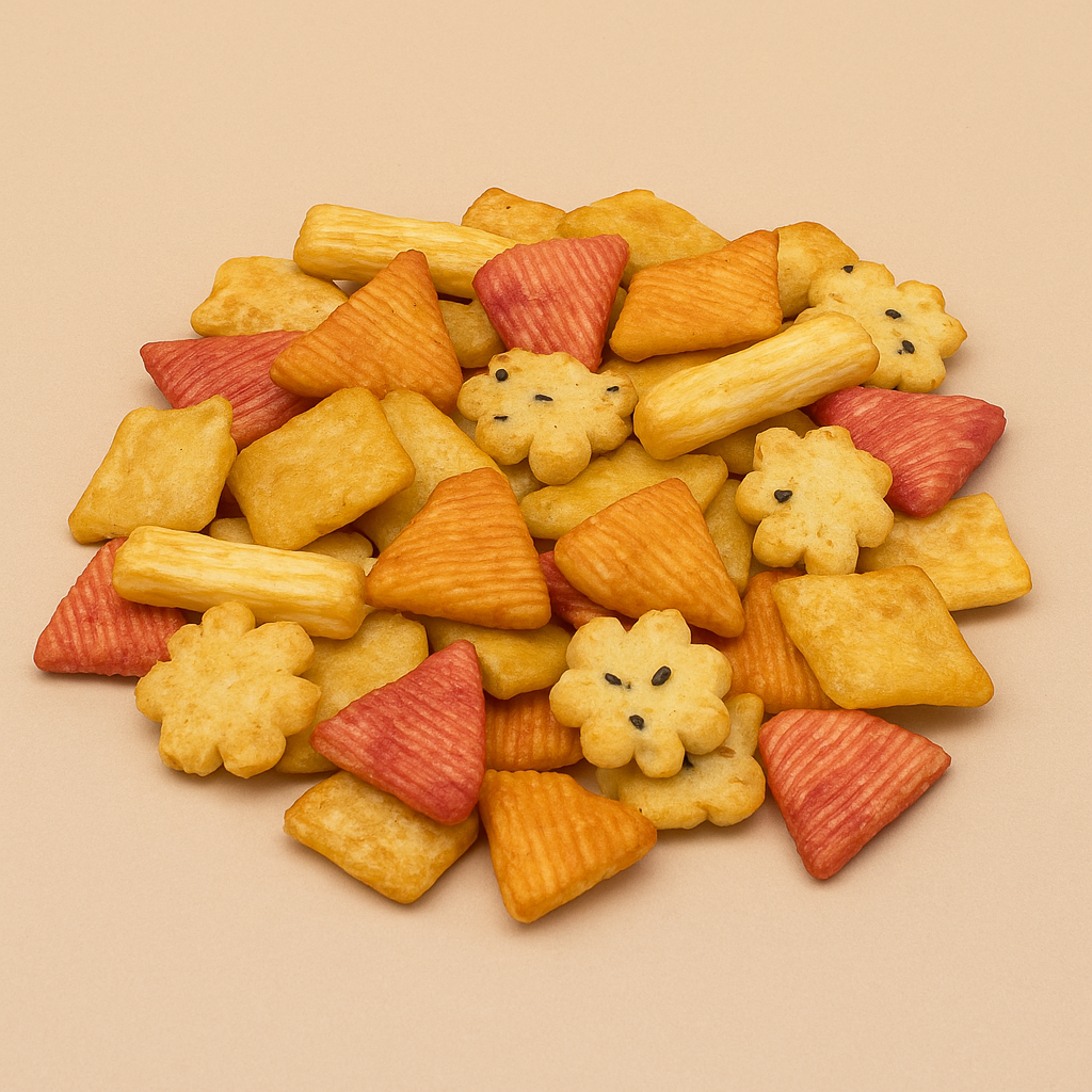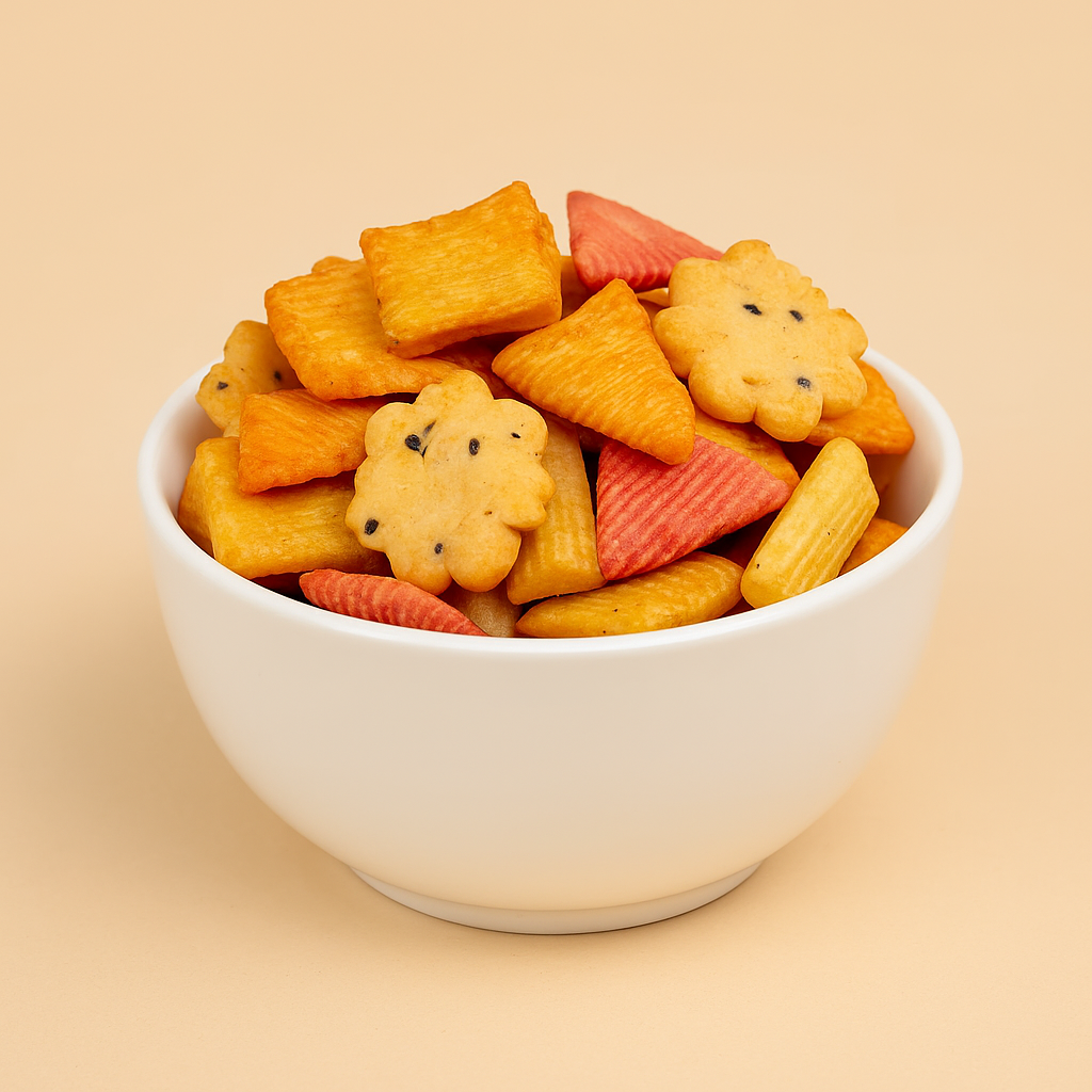 Un mélange coloré de crackers de riz croustillants. Disponibles en différentes formes et saveurs : barbecue, curry, herbes et fumée, ils sont parfaits en en-cas ou en apéritif.