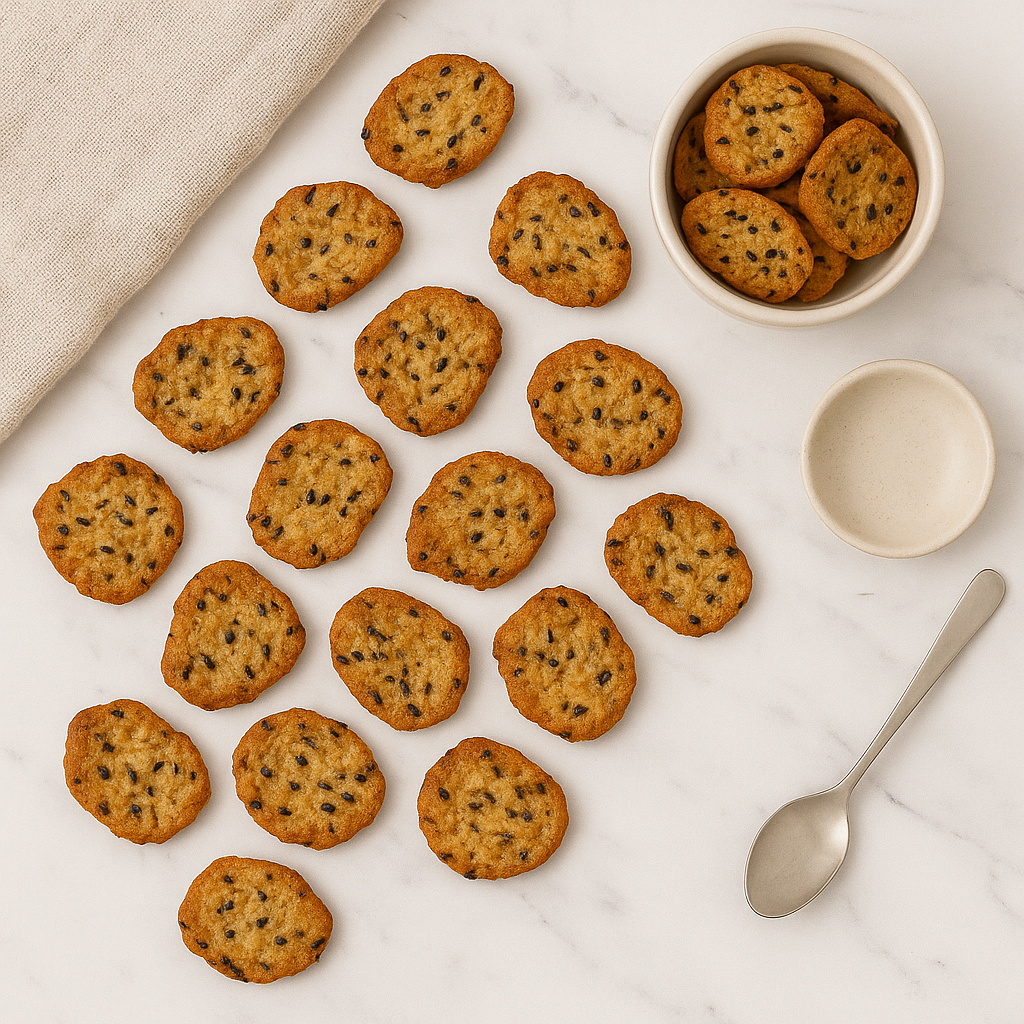 Craquelins de riz croustillants aux graines de sésame. Légers, fondants et savoureux, ils constituent un en-cas idéal entre les repas ou avec un verre.